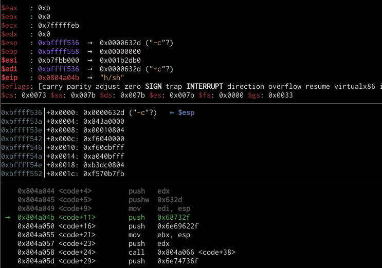 Then the EDX register is pushed to the stack (4 null bytes), followed by the -c string, in reverse order. Finally, EIP which holds the value of the top of the stack, is moved into EDI, so that the register can be user later as a pointer to the string on that position in the stack.