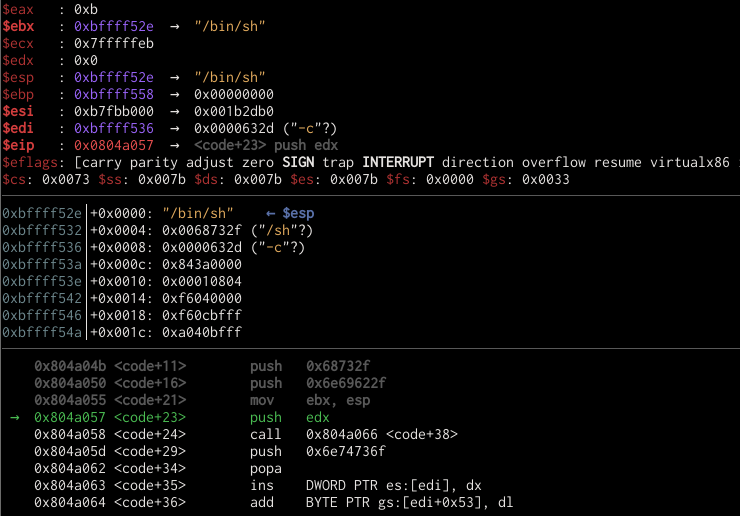 First the 0xb value gets pushed to the stack, and popped into the EAX register, which stores the value that corresponds to the system call number, which in this case is execve (code: 11). In addition to that, the EDX register is reset by using the cdq instruction, which copies the sign (bit 31) of the value in EAX to EDX.
