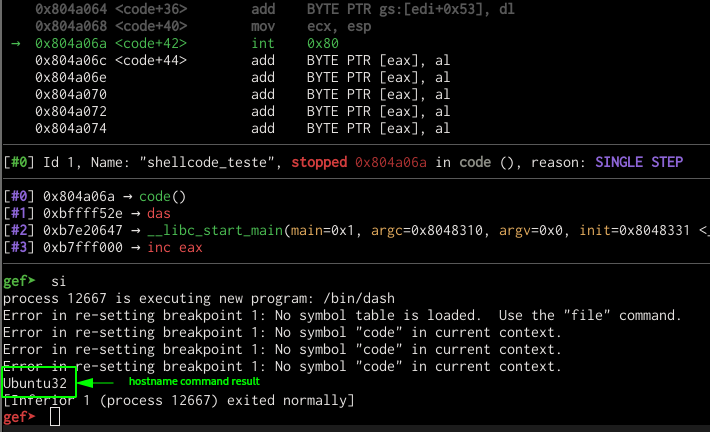 Finally, the interrupt cause the execve system call to be executed, and the output of the hostname command is returned and printed to the screen.