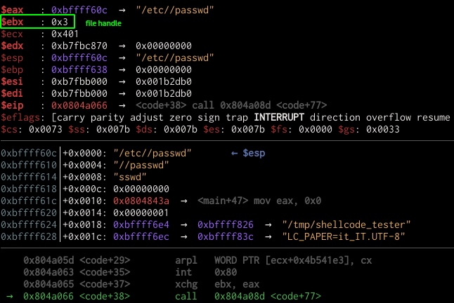 int fd(EBX) = 3 (file descriptor returned by theopensystem call)void *buf(ECX) = pointer to the strings to append to/etc/passwdsize_t count(EDX) = length of the string to write (34 decimal)