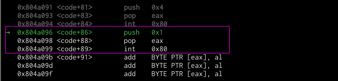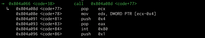 Using the si command (step into), we can see that before calling the interrupt with the int 0x80 instruction, the ECX register, which corresponds to the argv[] array, is filled with the following strings: