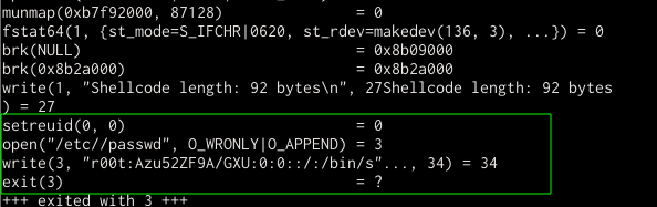 In our shellcode, the setreuid call is used to make sure the program has root privileges before it tries to append a new entry to the /etc/passwd file.