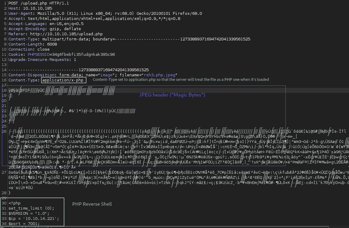 So we can upload a simple JPEG image, intercept the request, remove everything except for the magic bytes (we don’t need to be super precise), and add the PHP code for a reverse shell payload.